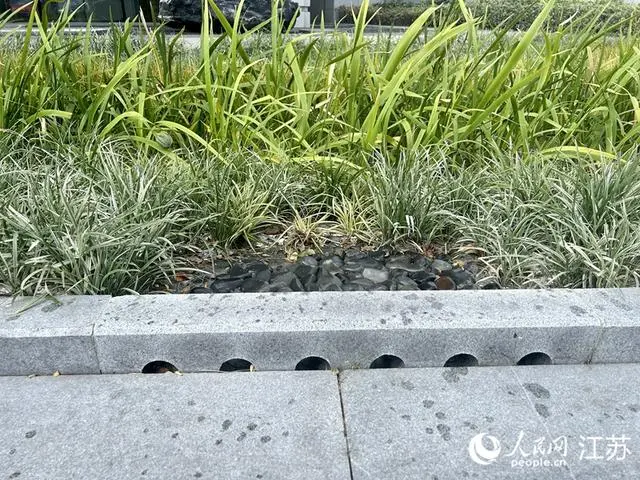 一处雨水花园内,围住花园的路缘石上,开了6个圆孔。看似普通的设计,却可以使雨水快速导入花园中,这是让“海绵”吸饱水的第一步。