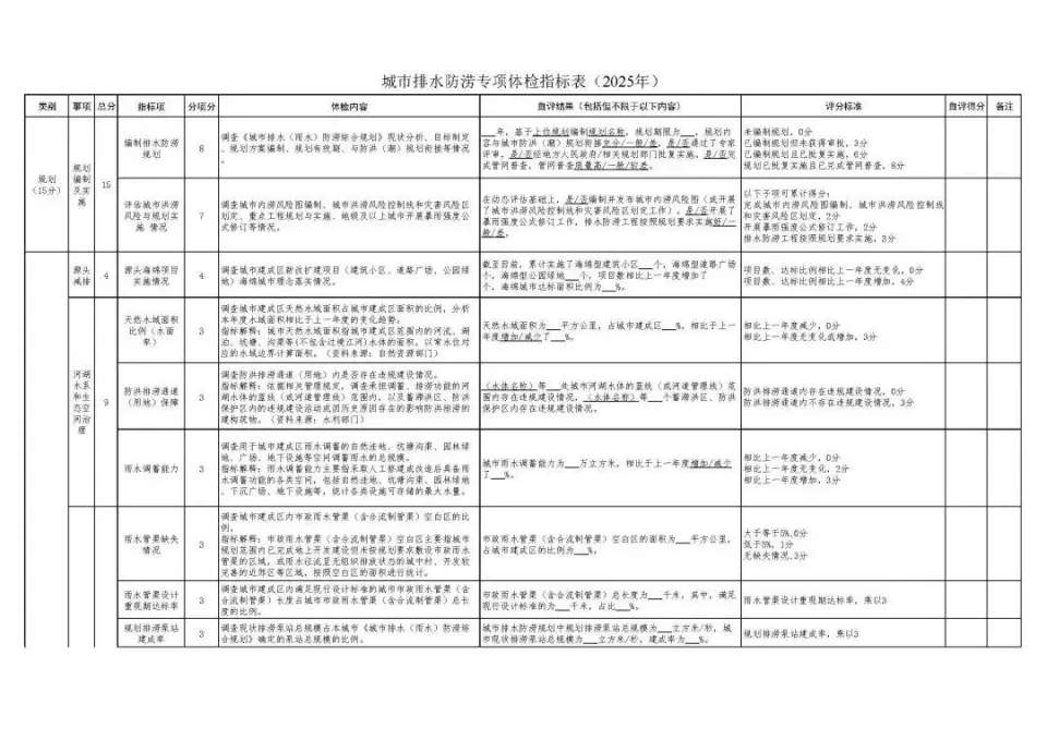 为深入贯彻落实党中央、国务院决策部署,建立城市内涝治理评估机制,我们在2024年组织开展城市排水防涝专项体检自评估的基础上,研究更新了《城市排水防涝专项体检指标表(2025年)》(见附件,以下简称“指标表”),现印发给你们。请你们结合2025年汛前准备、隐患排查等工作,组织开展城市排水防涝专项体检自评估,全面排查城市防洪排涝体系的问题短板和薄弱环节。专项体检要覆盖全部城市(包括地级及以上城市、县级市,不含下辖县、乡、镇)。针对体检发现的问题,属于本部门的,要明确措施和整改时限,持续推进解决;需要相关部门解决的,城市建设(排水)部门要报告属地政府,及时反馈和移交。
