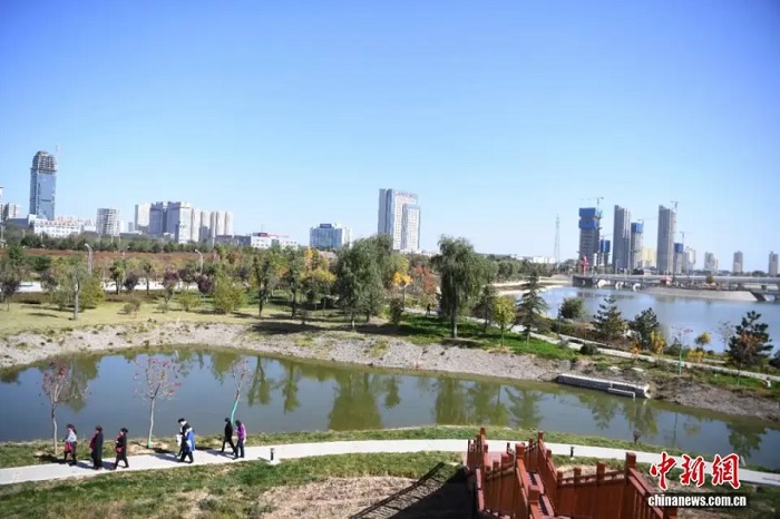 2020年10月22日,甘肃庆阳市“海绵城市”雨水蓄水地西峰区南湖吸引市民游玩。中新社记者杨艳敏摄