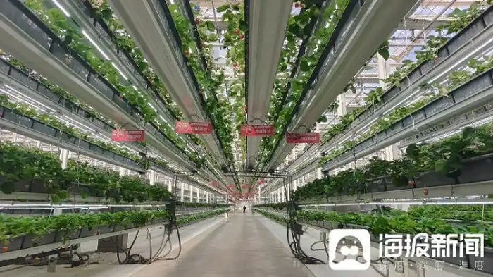 园区内2000余亩的现代农业产业园重点发展了草莓、樱桃、鲈鱼养殖三大产业。连片的草莓棚采用精准滴灌技术,根据植物不同生长期的需求,通过芯片精准控制滴灌水量,全自动水肥闭合循环系统可收集和重新利用营养液,实现水和肥料的循环利用,实现单株耗水节约66%。在樱桃大棚里,则靠着人工智能控制技术,给樱桃树“变换四季”,实现错峰成熟,填补国内2、3、4月优质樱桃的市场空白期。
