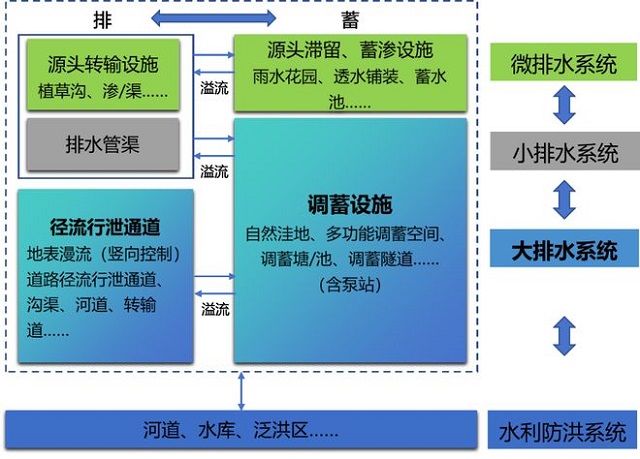 超标径流蓄排系统:也称大排水系统,负责有序地将超过排水管渠能力的雨水通过行泄和调蓄等措施安全控制,是城市洪涝韧性的核心,也是目前很多城市的短板。