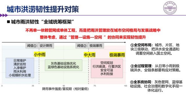 坚持“全域统筹框架”三原则: 全空间布局:在城市、片区、地块三个层级上,将洪水安全通道和调蓄空间作为刚性要素嵌入国土空间规划。