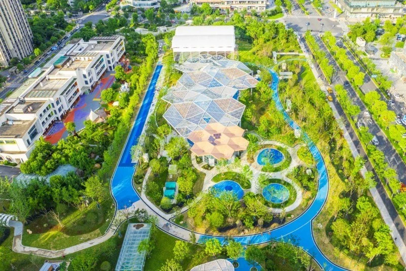 已建成投用的海云幼儿园南侧公园项目(海创未来人才公园),是方案落地见效的生动注脚。作为省级海绵城市重点项目,公园里的海绵元素随处可见:园区内布局了下凹式绿地、透水铺装等“海绵设施”,还充分利用公园绿地空间,精心设置了雨水花园,巧妙将海绵设施与景观绿化相结合。降雨时,地表径流先被植被和透水铺装吸收,多余雨水则顺着地势汇入雨水花园,经植物根系和砾石层的过滤,最终渗入地下或进入雨水管网。这套“渗、滞、蓄、净、用、排”的立体系统,既提升了公园的美观度,更增强了其应对雨水的“韧性”,让周边居民直观感受到海绵城市带来的生态福利。