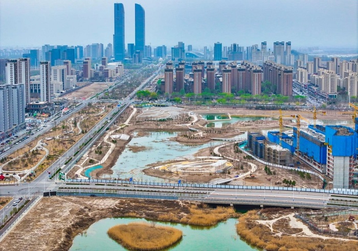 3月30日,俯瞰宁夏银川市金凤区王家湖海绵湿地公园建设现场,碧波荡漾、草木葱茏,整体已具雏形。施工人员正进行收尾施工,这里即将成为银川海绵城市建设的又一标杆工程。