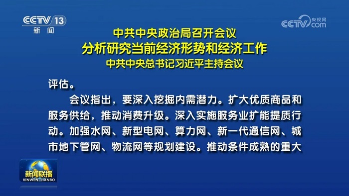 会议指出,要深入挖掘内需潜力。扩大优质商品和服务供给,推动消费升级。深入实施服务业扩能提质行动。加强水网、新型电网、算力网、新一代通信网、城市地下管网、物流网等规划建设。推动条件成熟的重大工程项目开工。