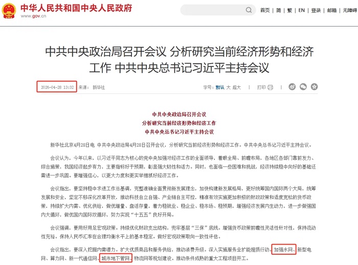 4月28日,中共中央政治局召开会议,聚焦当前经济形势与基础设施建设布局,明确提出加强水网、城市地下管网等“六张网”规划建设,释放城市地下管网建设升级的重磅政策信号。