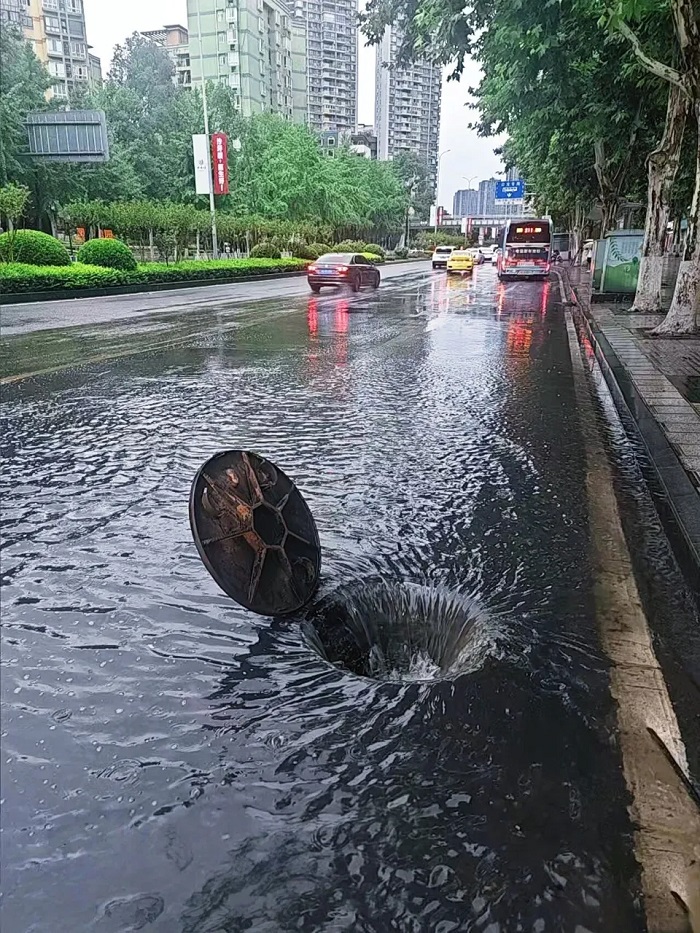 重庆沙坪坝区住建部门提前将下水道井口打开,以确保泄水通畅。沙坪坝区气象局供图