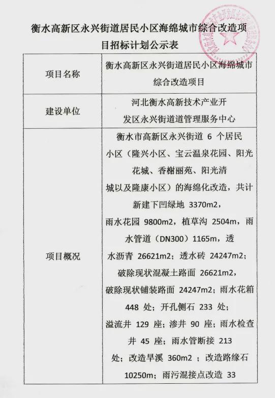 近日,衡水市公共资源交易平台发布衡水高新区永兴街道居民小区海绵城市综合改造项目招标计划公示。