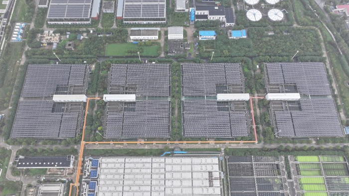 光伏项目:沉淀池上的“绿色发电站”持续赋能 竹园污水公司光伏项目创新性利用5~8号沉淀池顶部空间,通过水池四周钢结构载体铺设11000块545瓦峰值单晶硅双玻组件,配套28台196千瓦组串式逆变器,将产生的直流电逆变为三相交流电后,经3台箱式变压器升压后接入厂区2号主变6千伏母线侧。项目于2024年1月8日开工,同年9月24日顺利并网。截至2025年10月底,已实现累计发电808万千瓦时,创造收益约642万元,为企业直接节约电费约72万元。