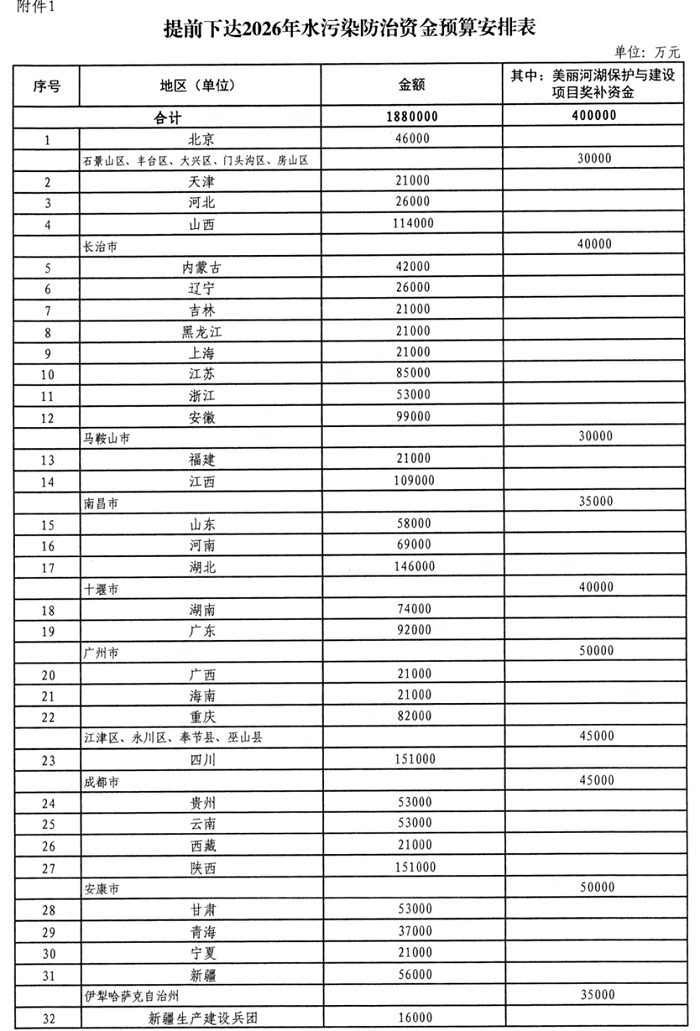 一、各省金额安排详见附件,项目支出列2026年政府收支分类科目“21103污染防治”,项目代码:10000015Z155110010004。