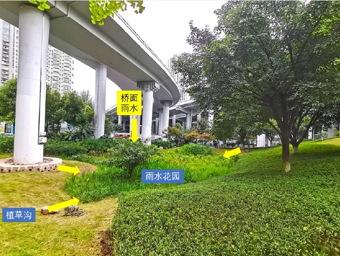 道路与广场 两江新区五里店立交提质增效一期,该项目在改造中落实海绵理念,花小钱办大事;借助桥下坡地空间,于坡地低洼地带设置雨水花园,收水顺畅;桥面径流经落水管收集后断接,在断接处设置消能设施,减少冲刷;周边绿地径流经植草沟自然汇流至雨水花园净化处理。