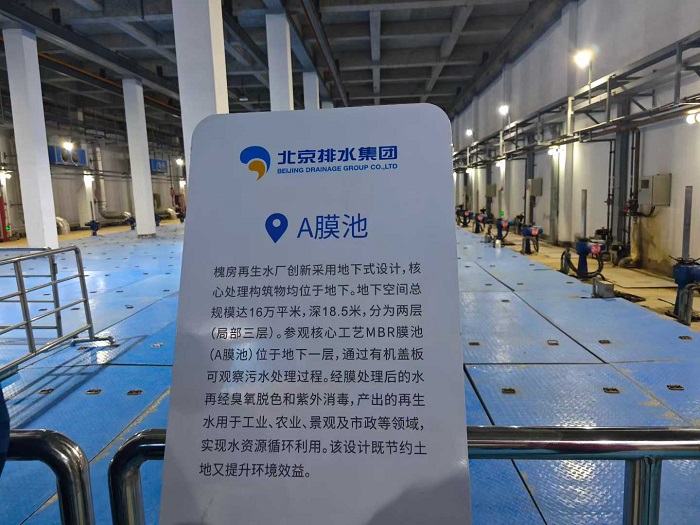 北京市槐房再生水厂是北京市“三年行动方案”建设项目,水厂规模60万立方米/日,同步在厂区内采用热水解+消化+板框脱水的污泥处理工艺,实现污泥的无害化处置,是全国规模最大、技术领先的封闭式地下再生水厂。水厂运用系统化建设运营理念和北排集团自主创新的“北排膜”、“北排红菌”、精确曝气及国际先进的污泥处置技术装备,建设运营高保障度的排水和再生水设施。其中,建设地下或半地下的全封闭处理设施,既达到再生水回用标准,又实现再生水设施运行无臭味、低噪音,并提高周边绿化水平。